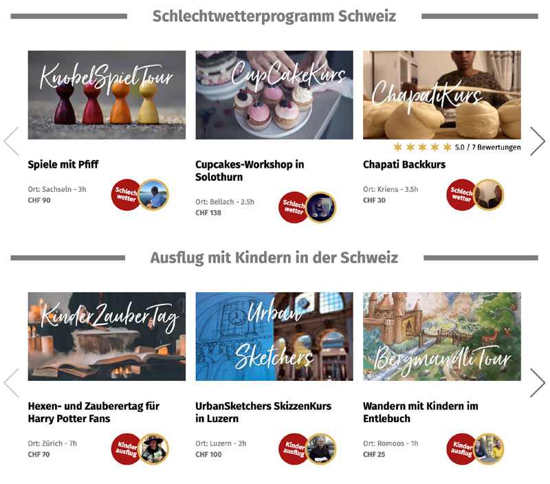 VisitLocals bietet verschiedene, einzigartige Touren aus der Region in der ganzen Deutschschweiz. Perfekt für Familienausflüge, Gruppenevents oder Firmenanlässe. Dank der grossen Vielfalt von über 200 verschiedenen Angeboten, findet jeder seine persönlich passende Tour.